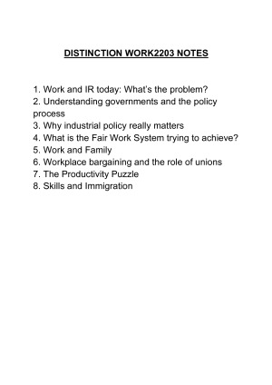 These are the WORK2203 notes that I made using the lecture notes, the set textbook and some of the readings set in class. Note structure follows the Unit Schedule 1. Work and IR today: Whats the problem? 2. Understanding governments and the policy process 3. Why industrial policy really matters 4. What is the Fair Work System trying to achieve? 5. Work and Family 6. Workplace bargaining and the role of unions 7. The Productivity Puzzle 8. Skills and Immigration