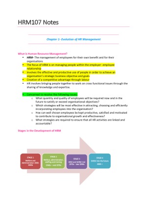 - Selling my detailed and high quality notes for HRM107 in which I achieved a HD. - Notes include all content from lectures, readings and the textbook from weeks 1-13. TOPICS INCLUDED: Chapter 1- Evolution of HR management Chapter 2- The Context of HRM Chapter 3- Employment relations, industrial relations and HRM Chapter 4- HRM and the law Chapter 5- HRM planning in dynamic environments Chapter 6- Recruitment and selection of talent Chapter 7- Learning, development and retention Chapter 8- Managing performance Chapter 9- Strategic rewards management Chapter 10- Workplace health and safety and employee wellness Chapter 11- Negotiating at the workplace - Includes a variety of diagrams, mind maps and tables which help you to understand the content better! - Headings are colour coded to break down information and topics. - I spent many hours creating these notes so all the hard work has been done for you!
