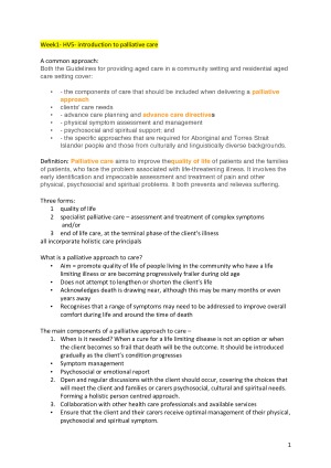 all weeks content included (week 1-5, 11-13) diagrams and pictures included to make it easy to understand Week 1 - introduction to palliative care Week 2 - legal and ethical aspects of palliative nursing Week 3 - chronic conditions that Palliative patients experience Week 4 - grief and bereavement/cultural considerations Week 5 - communication - difficult conversations and caring for families Week 11 - managing pain in palliative care Week 12 - symptom control Week 13 - recognising deteriorating patients