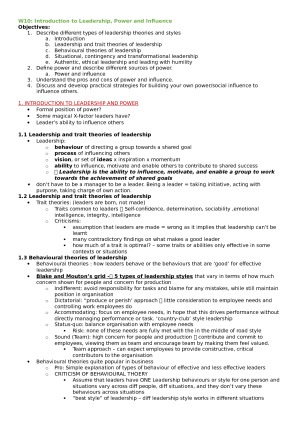Covers all weeks/topics extremely comprehensively and concisely and summaries of ALL readings. Since this course is taught mostly online, any information in the short videos is included and structured in a way that's easier to understand. (everything tested on the exam is included and elaborated upon - particularly hard to understand topics). I've colour coded and have tried to link concepts across topics (when i can) for you. Have fun studying! Topics covered: Week 1: Introduction to Theme 1 -Understanding yourself Week 2: Individual differences: cognitive ability, personality, and emotional intelligence Week 3: Motivation and goal-setting Week 4: Career goals, values, and ethics Week 5: Introduction to Theme 2 Understanding others Week 6: Diversity and culture Week 7: Team and group processes Week 8: Managing perceptions and conflict Week 9: Introduction to Theme 3 Leading and Influencing others Week 10: Leadership, power and influence Week 11: Communication and feedback Week 12: Career sustainability: managing relationships and stress