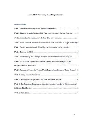Comprehensive study notes structured for intensive exam preparations. Final HD notes! Topics covered: Week 1. The value of an audit, auditor ethics & independence Week 2. Planning the audit. Business Risk. Analytical Procedures. Internal Controls Week 3. Audit Risk Assessment, and selection of the key accounts Week 4. Audit Evidence. Introduction to Substantive Tests. Limitation of Scope. Materiality Week 5. Testing Internal Controls. Use of Experts. Substantive testing examples. Week 6. Revision for MSE Week 7. Understanding and Testing IT Controls, Substantive Procedures Using GAS Week 8. GAS Normal Reports and Exception Reports, Audit Data Analytics, Audit Sampling, Fraud a “Special Risk” Week 9. Subsequent Events, the Types of Audit Reports, Introduction to “Going Concern” Week 10. Going Concern Assumption Week 11. Audit Quality, Expectation Gap, Other Assurance Services Week 12. The Regulatory Environment of Auditors, Auditors Liability to Clients, Auditors’ Liability to Third Parties Week 13. Final Exam