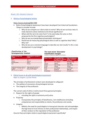 - All Psychological Assessment notes from lectures prior to Midsession Exam. Topic List: • Week 1: History of psychological testing, Ethical issues to do with psychological assessment. • Week 1: Guest Lecturer (Audio Lecture) - Organisational Psychology (please note that the only Guest Lecturer notes included are the Org Psych ones, as this was the lecture I chose to write about in the exam SAQs - Guest Lecturer notes from Week 5 and 6 are not included) • Week 2: General Issues: Theoretical and practical issues to do with the choice of a psychometric test (Carroll’s Three Stratum Model). Applied issue: Intelligence testing and theoretical underpinnings of IQ tests • Week 3: General issue: Using theoretical models to guide our administration, scoring and interpretation practices. Applied issue: Using the WAIS-IV • Week 4: General issues: The Science of test interpretation and how to communicate your findings with your client - Includes 3 FREE Practice Essay Questions AND Answers to cover (1) Week 1, (2) Weeks 2/3 and (3) Week 4 material, incase the exam question is focused on one of those particular weeks I scored FULL marks in this exam based on these notes and practice essays. Check out my notes for the Final Exam too (based on Ethics)