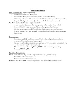 Notes I took in to the Exam hall for Corporate Law (BLAW20001) in the University of Melbourne (Semester 1,2018), and got H1 - Comprehensive - Easy to read - Titled as per topic Topics include: 1. Choice of form of business 2. Companies 3. Shares and Rights (includes Variation of Class Rights, Increasing Share Capital and Maintenance of Capital) 4. Internal Governance Rules (Including legal effect and Equitable Limitation/Gambotto) 5. Power (including appointment of Directors and Removal of Directors) 6. Board and Members' meetings 7. Irregularities 8. Contracts 9. Director's Duties 10. Reporting and Disclosure 11. Remedies Additional information including general knowledge and dictionary that will be useful for the exam