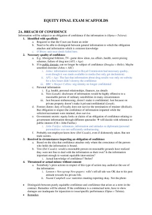 These scaffolds provide a logical structure and response to problem questions in the final exam. Reference is made to all of the cases. They are useful when studying for the final closed-book exam because they are succinct and concise. The scaffolds cover the following topics: breach of confidence, estoppel, remedial equity, nature and constitution of trusts, operation of express trusts, fiduciary obligations, resulting trusts, constructive trusts, tracing, charity.