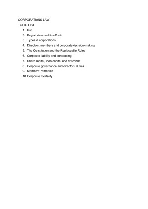 Comprehensive HD notes for LAW3112 (Corporations Law). Include details pertaining to all the examinable components of each topic listed below, including summarised facts and principles of the relevant cases and references to all relevant statutory provisions. Structured in a very simple, yet detailed manner for easy use. Includes a collation of pointers for issue spotting and some suggested adaptable starting sentences to assist with answering problem questions. TOPIC LIST 1. Into 2. Registration and its effects 3. Types of corporations 4. Directors, members and corporate decision-making 5. The Constitution and the Replaceable Rules 6. Corporate liability and contracting 7. Share capital, loan capital and dividends 8. Corporate governance and directors’ duties 9. Members’ remedies 10. Corporate mortality