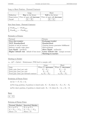 Comprehensive notes for the course. Everything in the notes will be in the exam and has been structured so that everything flows nicely. Achieved an overall mark of 90, with 100% for the final exam. Topics: 1. Fundamentals of Forwards and Futures; Hedging with Futures 2. Pricing Futures 3. Currency Swaps 4. Fundamentals of Options 5. Trading Strategies involving Options 6. Binomial Option Pricing Models 7. Wiener Processes & Ito’s Lemma 8. Black-Scholes Option Pricing Model 9. Options on indices, currencies and futures 10. The Greek Letters 11. Numerical Procedures