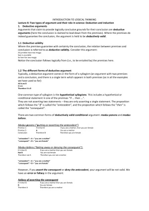 Although lecture notes were given, I further refined these notes and removed all the extra info. Lectures include: Lecture 2: Nonrational forms of persuasion and barriers to logical thinking Lecture 3: Clarifying the ground rules Lecture 4: The double-edged sword of language: friend and enemy Lecture 5: Identifying, analysing and casting (diagramming) Lecture 6: Two types of argument and their role in science: Deduction and induction Lecture 7: Evaluating arguments (Part 1): Concepts of truth, validity, soundness & cogency. Formal fallacies (structural errors)