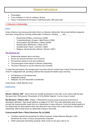 Full set of notes for the contracts course. Covers all topics with a focus on how to answer Exam and Problem Question scenarios. • Introduction (Structuring) • Agreement – offer • Agreement – acceptance • Intention • Consideration • Estoppel • Intention to create legal relations • Certainty/completeness • Formalities requirement of writing • Capacity • Privity • Illegal and void by CL • Illegal and void by statute • Effects of illegal/void contract • Terms • Misrepresentation • Mistake • Undue Influence • Unconscionability • Duress • Termination • Frustration • Damages • Equitable Remedies For my own personal reasons I effectively failed the final exam and thus the reason for my mark. The notes themselves are great and you can easily HD if you use them holistically to answer the exam questions.