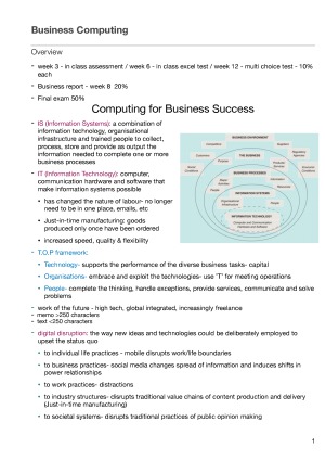 ALL LECTURE NOTES HIGHLY ORGANISED & NEAT COLOUR CORDINATED Topic List: Computing for Business Success Business Analysitics Data Visualisation Designing Business Solutions Human Computer Ineraction - Designing Business Solutions Business Communitaction Managing Data Resources eBuisiness & eCommerce Social Networks & Mobile Technologies Communication, Chain Managemnet & Project Issues Security, Privacy Issues Usability - technology Managing IS/IT Security Bahaviour