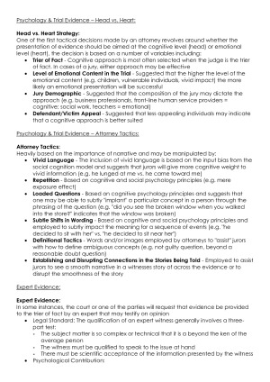 *** INCLUDES LEARNING OBJECTIVES *** Includes all content from the weekly lectures as well as relevant information from the weekly readings! Information is organised into clear sections for each topic: - Topic 1: Introduction & Theoretical Foundations - Topic 2: Theories of Crime - Topic 3: Crime Rates: Objective & Subjective - Topic 4: Criminal Investigation I: Memory and Eyewitnesses - Topic 5: Criminal Investigation II: Offender Profiling - Topic 6: Criminal Investigation III: The Psychology of Questioning & Interviewing - Topic 7: The Trial Process I: Pre-Trial Issues - Topic 8: The Trial Process II: Adjudication - Topic 9: Sentencing & Diversion Programs - Topic 10: Corrections & Rehabilitation