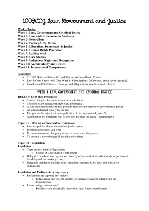 Notes from 1003CCJ. Great for end of semester exams, covers a lot of content. Week 1: Law, Government and Criminal Justice Week 2: Law and Government in Australia Week 3: Federalism Week 4: Politics & the Media Week 5: Liberalism, Democracy & Justice Week 6: Human Rights Protection Week 7: Reading Week Week 8: Case Studies Week 9: Indigenous Rights and Recognition Week 10: Accountability and Justice Week 11: International Comparisons