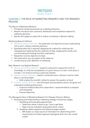Distinction notes - complete overview of marketing 204 from both the textbook and lecture notes Topic List: 1. The role of marketing research and the research process 2. Defining the problem 3. Formulating conclusions and writing the final report 4. Qualitative research 5. Digital research using secondary data 6. Survey research 7. Observation 8. Experimental research and test marketing 9. Measurement 10. Questionnaire Design 11. Sample design and sample size 12. Editing and Coding