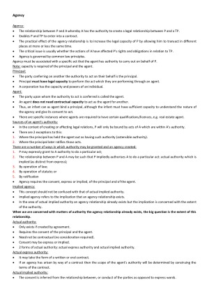 Covers all topics raised during the lectures, including: -Law of Agency -Unconscionable Conduct -Sale of Goods -Security Interests. All relevant legislation, cases and definitions are included. Achieved an 82 for this unit.
