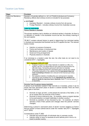 A large number of pages on a set of notes, is no way indicative of their quality. If you're intending on bringing them into the exam with you, a large set of notes will likely end up freaking you out or being of little use as you struggle to navigate/make sense of them. This set of notes provides you a comprehensive summary of content that was examinable in the final exam in Summer 2017/18 and is set out in a logical, easy to navigate and accessible way: - Residency Tests - Sources of Income (Ordinary and Statutory incl. CGT) - Deductions (General and Specifically not deductible/Deductible - including calculating depreciation expense) - Calculating Income Tax Payable The notes cover content covered in weeks 4,5,6,7,8 and 10. I have also provided brief summaries on: - Fringe Benefits - GST - Tax Accounting (Cash v Accrual) - Trading Stock - Small Business Entities Even though not directly examinable, the other topics often will draw on them. I have since refined these notes since completing the subject in summer 17/18, having progressed through the taxation module of the CA. So, rest assured, you will be very well prepared for the exam should you study from these notes and subsequently bring them into the exam with you.