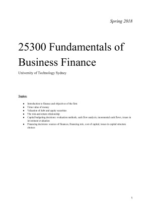 Extensive but well-condensed notes including detailed information on each topic to help you with study and preparation for your final exams! Includes formulas and information to help you clearly understand the subject, and includes notes from all lectures besides introduction and revision weeks, specifically topics: - Introduction to finance and objectives of the firm - Time value of money - Valuation of debt and equity securities - The risk-and-return relationship - Capital budgeting decisions: evaluation methods, cash flow analysis, incremental cash flows, issues in investment evaluation - Financing decisions: sources of finances, financing mix, cost of capital, issues in capital structure choices Good luck!