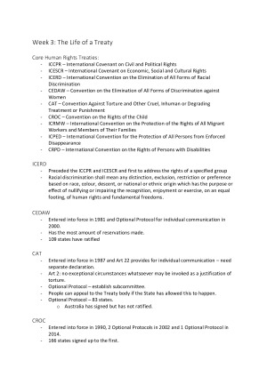 Notes for the final exam covering all topics throughout the semester Week 1 and 2: UN and International Bill of Rights Week 3: Life of a Treaty Week 4: Right to Freedom of Religion and Expression Week 5: Right to Liberty and a Fair Trial Week 6: Right to Bodily Integrity and Freedom from Torture Week 7: Slavery and Slave Like Practices Week 8: Refugees and Asylum Seekers Week 9: International Humanitarian and Criminal Law Week 10: Right to Work Week 11: Right to Health and Education Week 12: Environment and Human Rights Week 13: Subject Review and Exam Help