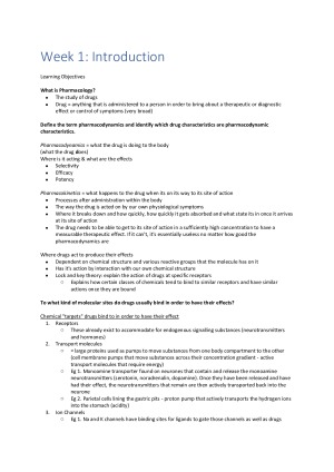 This document contains notes on all the videos that are given throughout the semester, including lecture slides notes and pictures, practically word-for-word summaries provided by the lecturer as well as other researched info required to provide a complete understanding of the topic. It is a very easy to follow and visual compilation of notes that follow the learning outcomes to ensure you excel at your pharmacology course. The following topics are covered: Week 1: Introduction 2 Week 2 Pharmacokinetics 7 Week 3: Drugs Acting on the ANS 21 Week 4: Cardiovascular Drugs Part 1 31 Week 5: Cardiovascular Drugs Part 2 48 Week 6: Endocrine System Drugs 57 Week 7 Drugs on Inflammation and Pain 72 Week 8: Respiratory Drugs 84 Week 9: Gut and Metabolism 92 Week 10: Chemotherapy 114 Week 11: Drugs for Affective Disorders 132 Week 12: Drugs for other CNS Disorders 144