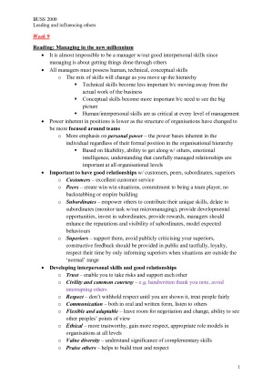 Extensive notes including all examinable material - online modules, ALL required readings and face to face lectures - from the topic Leading and Influencing Others. Includes: 9. Introductory lecture 10. Leadership, power and influence online module 11. Communication and feedback online module 12. Career sustainability online module 13. Exam information and all required readings for these topics
