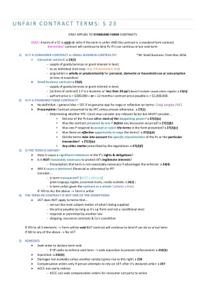 These are full exam notes for the UWA Consumer Law JD unit. Notes are organised by topics and include case briefs. At the end is also an answer structure guide for each topic. Topics covered are: - Misleading and deceptive conduct - False & misleading representation - Consumer guarantees - Liability of manufacturers for goods with safety defects - Unconscionable conduct - Unfair contract terms - Remedies