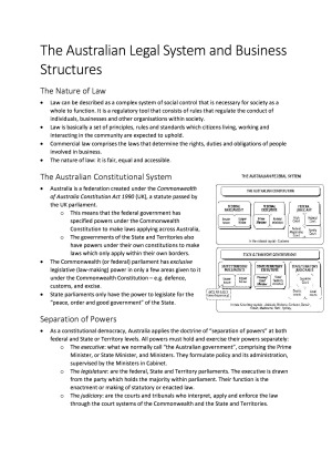 These notes are a comprehensive summary of LSSU251 compiled from lectures, lecture notes, and textbook readings. I received an HD in this unit with a mark of 91, so these are notes are very high quality. They explain complex legal ideas, while explaining them succinctly, and also contains an explanation and application of all relevant statutes and common law cases particular to this unit. Given that the final examination for this unit is an open book exam, these notes are an invaluable tool to take into the exam with you. Topics covered in these notes include: Topic 1 - The Australian Legal System and Business Structures Topic 2- An Overview of the Law of Torts Topic 3 - Negligence Topic 4 - Contracts I - Formation (Agreement, Intention & Consideration) Topic 5 - Contracts II - Genuine Consent, Enforceability, Capacity, Illegality and Formality. Topic 6 - Contracts III - Terms, Interpretation, Discharge and Remedies Topic 7 - Consumer Law I - Consumer Guarantees, Misleading or Deceptive Conduct, Unconscionable Conduct, Liability and Remedies Topic 8 - Consumer Law II - Competition Law and Sale of Goods Topic 9 - Electronic Commerce Topic 10 - Finance Law and Bankruptcy Topic 11 - Insurance Law