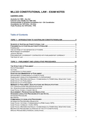 T2 2018 Deakin Constitutional Law notes including case summaries and legislative snippets. I LOVED this subject and my notes are a mixture of textbook information, topic summaries and lecture material (I tried to write down as much as the lecturer explained as close to word-for-word as possible). Topics covered: Topic 1: Introduction to Australian Constitutionalism Topic 2: Parliament and Legislative Procedures Topic 3: Characterisation Topic 4: Financial and Economic Powers Topic 5: External Affairs Topic 6: The Executive Topic 7: Inconsistency and Intergovernmental Immunities Topic 8: Constitutional Rights and Freedoms Topic 9: Separation of Powers