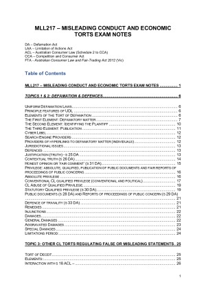 T2 2018 Deakin notes including case summaries and legislative snippets. Notes are a mixture of textbook information, topic summaries and lecture material. Topics covered: Topics 1 & 2: Defamation and Defences Topic 3: Other CL torts regulating false or misleading statements Topic 4: Key concepts underpinning ACL Topic 5: The prohibition on misleading or deceptive conduct Topic 6: Conduct which may be misleading or deceptive Topic 7: Advertising Topic 8: Specific provisions on false or misleading representations Topic 9: Remedies for a contravention of the ACL Topic 10: Liability for manufacturers for goods with safety defects Topic 11: Other torts protecting economic interests