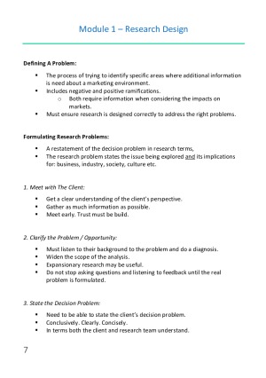 Exam Notes used for exam to complete with a high distinction. Incudes table of contents for important topics. Includes the following modules: 1. Research Design. 2. Secondary Data. 3. Sampling. 4. Primary Data (Observation). 5. Primary Data (Communication). 6. Qualitative Analysis. 7. Primary Data (Questionnaire). 10. Interpreting Results. 11. Communicating Findings. Does not include modules 8 and 9 as these were not required for the exam.