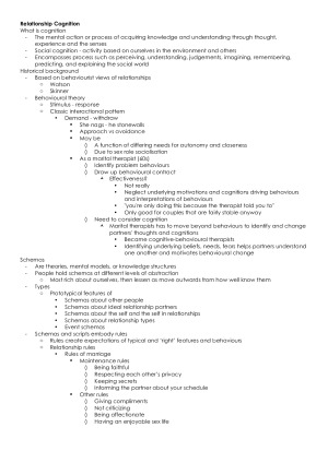 Lecture and Tutorial content - Weeks 1-12 Easy to follow and divided by topic With practice MCQs by me :) Topics - Interpersonal attraction - The Psychology of Beauty - Mate Selection, Love, and the Pair Bond - Relationship Cognition - Emotion - Communication and conflict in relationships - Friendship and Social Support - Betrayal, Trust, and Forgiveness - Psychopaths in intimate relationships - Family Dynamics - Sex and Sexuality - Violence in Relationships - Relationship Loss and Repair