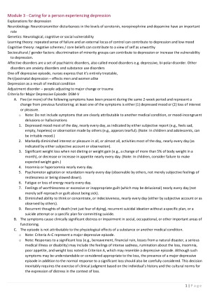 Module 1 – Unit Introduction Module 2 - Mental health assessment and Mental Health Act Module 3 - Caring for a person experiencing depression Module 4 - Caring for a person experiencing suicidal thoughts and behaviours Module 5 - E - Caring for a person experiencing anxiety Module 6 - Substance use A Module 7 - Substance use B Module 8 - Older people’s mental health Module 9 - Young people’s mental health Definitions Medications