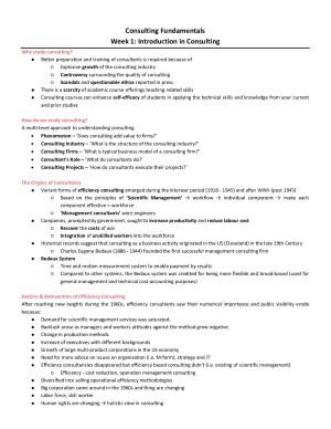This is a summary of Consulting Fundamental week 1-12. All essential materials that you need to prepare for your open-book exam are all here including all cases and the missing answers from the classes! Go grab one and be confident for your final exam! There is no week 5 due to presentation week. Week 1: Introduction to Consulting Week2: Theoretical and Empirical Perspective of Consulting Week 3: Consulting Operating Models & Engagement Lifecycles Week 4: Managing Client-Consultant Relationship Week 6: Structured Problem Solving Week 7: Structured Communication Week 8: Managing Change as Consultants Week 9: Strategy Consulting Week 10: Operations Consulting Week 11: Career Management in Consulting Week 12: Professional Issues and Ethics