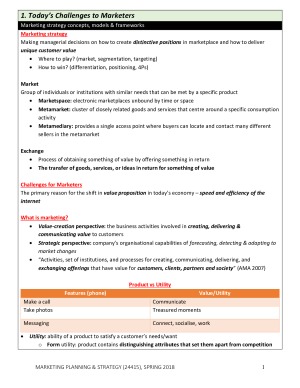 Succinct notes covering chapter 1 to 5, and 7. All of the lecture content is condensed in preparation for the mid-session quiz. The notes cover the following lectures: Ch 1. Today's Challenges to Marketers Ch 2. Strategic Marketing Planning Ch 3 & 4. External and Internal Environmental Analysis Ch 5. Customers, Segmentation and Targeting Ch 7. Branding and Positioning