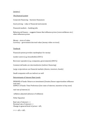 Summary notes and formulae are sorted by the weekly topic. Summaries for weeks: 1: The Financial System 2: Time Value of Money (Single Amounts) (Not Included) 3: Time Value of Money (Multiple Amounts) (Necessary formulas are given) 4: (continuation of Time Value of Money) (Not Included) 5: Time Value of Money Problems 6: Bond Valuation 7: Share Valuation 8: Capital Budgeting 9: Risk and Return 10: (N/A - Class Test) 11: Raising Capital 12: The Global Financial Crisis Note: These are SUMMARY notes and do not contain ALL subject content, thus should not be used solely for the final examination.