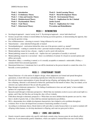 2000CCJ Psychology of Crime notes: Good bullet point styled notes of the key information required for the final exam. Covers all the important information in a simplified and easy to memorise review which will be extremely helpful during exam revision. Week 1 – Introduction Week 2 – Evolutionary Theory Week 3 – Crime and Genetics Theory Week 4 – Biobehavioural Theory Week 5 – Psychoanalytic Theory Week 6 – Trait Theory Week 7 – Behavioural Theory Week 8 – Social Learning Theory Week 9 – Moral Development Theory Week 10 – Environmental Theory Week 11 – Implications for the Criminal Justice System Week 12 – Implications for Crime Prevention and Rehabilitation Hope these help you the way they helped me!