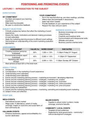 – 64 pages of in-depth notes taken in both lectures and tutorials throughout the course – Includes lecture content, tutorial information, examples, guest speaker notes, diagrams from slides and information given about the assessments – Colour-coded with definitions, case studies, references and assessment requirements – Easy to read, nicely formatted notes that helped me achieve a distinction in this subject TOPICS • Introduction to the Subject • Considerations in the Marketing of Event Experiences • Understanding Event Attendees • Understanding Event Attendees II – How to Find Them and What Motivates Them • Events and the Strategic Marketing Planning Process • Event Market Strategies – Event Marketing Mix I • Event Marketing Mix II – Promotion and IMC • Marketing Trends to Apply to Your Event • Price and Place (Distribution) • Event Quality and Satisfaction • Monitoring, Controlling and Evaluating Event Marketing • Subject Review and Reflection