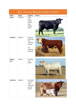 Table of breeds for ANS101. Includes pictures of breeds for easy comparison as well descriptions and place of origin for some sections. Includes: - beef cattle breeds - dairy cattle breeds - goat breeds - sheep breeds does NOT include horse, pig or camelid breed identification