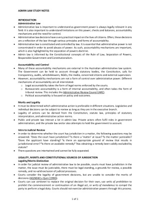 All lecture notes and reading notes from weeks 1-12 of the course. TOPIC LIST Introduction Legality, Merits and Constitutional Sources of Jurisdiction Statutory Sources of Jurisdiction Common Law Sources of Jurisdiction and Justiciability Supervisory Jurisdiction of State Supreme Courts Delegated Legislation Common Law Remedial Model What are Jurisdictional Errors? Remedie Introduction to Grounds of Review and Procedural Fairness Procedural Fairness Hearing Rule Bias and Statutory Procedures Considerations Improper Purpose: Unauthorised Purpose and Irrelevant Considerations Role of Policy in Decision-Making Facts/Law Distinction Jurisdictional Facts Legal Reasonableness Human Rights Norms Access to Judicial Review Statutory Restrictions on Judicial Review Tribunals and Merits Review Internal Review Ombudsmen Freedom of Information