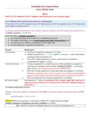 I obtained a HD with these notes. Easy guide and work through template provided to save time in the exam. Topics covered include: 1. Income tax: - Ordinary Income - Exempt income and Non-assessable non-exempt Income - General deduction - Provision that deny or limit deductions 2. GST 3. Capital Allowance 4. Trading Stock 5. Capital Gain Tax 6. Taxation of Companies and Shareholders 7. Taxation of Superannuation
