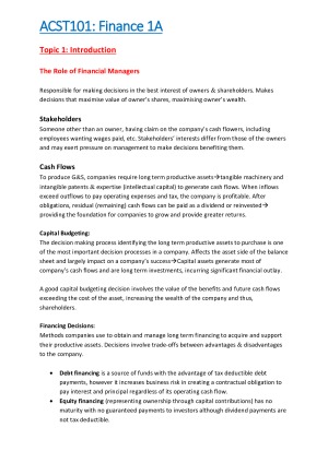 For the thoroughly enjoyable and informative ACST101 unit, these comprehensive study notes are based on Lecture notes, Tutorial summaries and Homework questions as well as a detailed summary of all relevant textbook material. With the right notes and preparation, you can perform well in ACST101 unit across the assessments and exams throughout the semester. My notes cover all difficult questions that can be covered within the unit as well as providing accurate diagrams for all Time Value of Money and Bond and Share Valuation models. I have even included the cheat sheet I used in my final exam to give you a bit of extra help! A general overview of the topics included over the 13 week semester: The Financial System, The Time Value of Money, Multiple Cash Flows and Annuities, Bond and Share Valuation, The Fundamentals of Capital Budgeting, Risk and Return and the GFC.