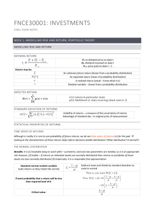 Here are my notes I used for investments last semester. I made a few of my own diagrams to help me understand the content Topics covered: Week 1: Modelling risk and return, portfolio theory Week 2: Optimal Portfolio Choice Week 3: the CAPM Week 4: Single index models Week 5: Multifactor models and arbitrage pricing theory (APT) Week 6: Portfolio performance evaluation Week 8: Fixed income valuation Week 9: Fixed coupon bonds Week 10: The term structure of interest rates Week 11: Managing fixed income portfolios Week 12: Floaters and interest rate swaps