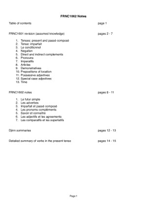 These are the notes I kept through my semester of FRNC1602. They include: - revision from all of FRNC1601 - summaries of key Djinn content - present tense verbs - imparfait and passé composé - futur simple - savoir and connaître - all other tested grammar points Exceptions to rules and sentence examples are also included.