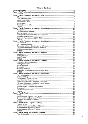 Comprehensive notes for Contract law. These notes include only the relevant principles, legislation and cases, NOT a summary of all textbook chapters. Take these notes into class and you'll know exactly whats going on. Short summaries of important cases are also included. I have also included a thorough 'guide' to answering questions in an exam, which is a compilation of tips from my tutor and unit coordinator. I received a D in the unit, my writing let me down however I knew content back to front! Topics covered are as follows. Formation: - Offer - Acceptance - Consideration - Intention - Certainty - Formalities Privity Terms: - Express Terms - Extrinsic Evidence - Construction and Exclusion Clauses - Implied Terms Termination: - Breach - Agreement, Abandonment, Contingent Condition - Repudiation - Consequences Estoppel Vitiating Factors: - Misrepresentation, Misleading & Deceptive Conduct - Unconscionable Conduc t Remedies