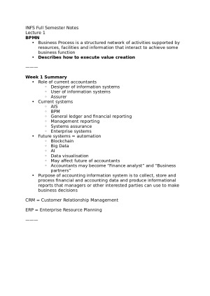 Includes - Lecture 1 Key Accounting Systems - Lecture 2 BPMN - Lecture 3 Risk and Control - Lecture 4 Order to Cash SAP - Lecture 5 Blockchain and General Ledger - Lecture 6 The Cloud - Lecture 7 Management Reporting and Blockchain - Lecture 8 Data Visualisation - Lecture 9 Relational Database Structures - Lecture 10 Testing and Specific Process in the Enterprise System - Lecture 11 Continuous Assurance Note: L12 is for presentations and L13 is a revision week