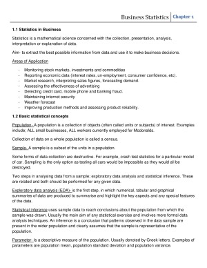Complete summarised notes of the Business Statistics subject. It is broken down in weekly sections for easy understanding. Notes comprised of lecture and textbook readings.