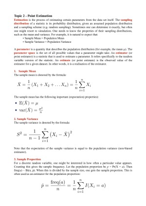 This is a comprehensive compilation of information from MAST20005 lectures, the textbook, tutorials, practicals, workshops, problem booklets and other useful sources I found online to aid my study. Each section (particularly the harder concepts) is supported by easy to read and understand dot points, diagrams, pictures and thorough example exam-style questions. Includes all summarised formulae required to know for each topic. Topics included are: 1. Introduction to statistics and review of probability concepts. 2. Point estimation 3. Interval estimation (calculating confidence intervals) 4. Regression 5. Hypothesis testing (power, Type I and Type II errors, p-values) 6. Distribution free methods (Wilcoxon tests, goodness of fit tests) 7. ANOVA 8. Ordered statistics and quantiles (cdf's, pdf's) 9. Bayesian inference (Bayes' theorem, prior and posterior distributions) 10. Asymptotics and optimality (sufficiency, efficiency, derivation of MLE sampling distribution)