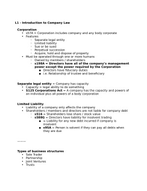 Includes - Lecture 1 Introduction - Lecture 2 Incorporation and the Corporate Veil - Lecture 3 Directors & Company Management - Lecture 4 Internal and External Company Relationships - Lecture 5 Membership & Share Capital - Lecture 6 Securities & Disclosure - Lecture 7 Directors Duties, Best Interest and Proper Purpose - Lecture 8 Directors Duties, Conflict and Care - Lecture 9 Directors Duties, Consequences of Breaches - Lecture 10 Company Legal Rights against others - Lecture 11 Member Rights and Remedies - Lecture 12 Insolvency - Lecture 13 Revision