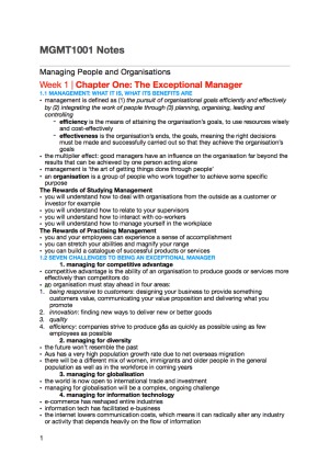 73 Pages of high-quality textbook notes covering every chapter from the textbook 'Management: A Practical Introduction' (2018) by Kinicki, A. Scott-Ladd, B. D., Williams, B., & Perry, M. Topics covered include: 1 - The Exceptional Manager 2 - Motivating Employees 3 - Groups and Teams 4 - Individual and Group Decision Making 5 - The Manager's Changing Work Environment and Ethical Responsibilities 6 - Organisational Culture, Structure and Design 7 - Power, Leadership and Effective Communication 8 - Managing Individual Differences and Behaviour 9 - Strategic Human Resource Management 10 - Strategic Management 11 - Global Management