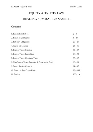 Summaries compiles information from lectures, tutorials, textbooks, commentary, legislation and case law. Textbook used was M W Bryan and V J Vann, Equity & Trusts in Australia (2012, Cambridge University Press, Victoria). Very thorough and includes sources of all information. Written for the purpose of problem-solving during exams. Topics covered include: 1. Equity: Introduction 2. Breach of Confidence 3. Fiduciary Obligations 4. Trusts: Introduction 5. Express Trusts: Creation 6. Express Trusts: Formalities 7. Express Trusts: Charitable Trusts 8. Non-Express Trusts: Resulting & Constructive Trusts 9. Trustee Duties & Powers 10. Trustee & Beneficiary Rights 11. Tracing