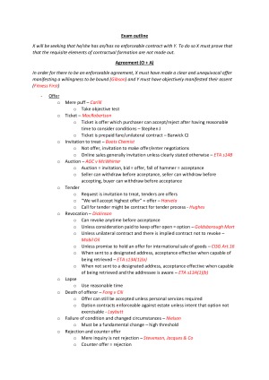 Final exam notes containing all relevant case law and legislation. These notes compile lecture content, tutorial content and textbook readings into a concise format that is easy to apply for exam purposes. Headings include: - Offer and acceptance - Consideration - Intention - Certainty - Privity - Formalities - Capacity - Express terms - Exclusion clauses - Implied terms - Implied duty of good faith - Estoppel. Do note that these are student notes and are not meant to replace what is taught in the course. When in doubt, follow the direction and advice of lecturers and tutors.