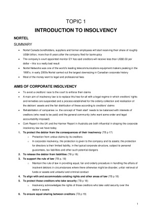 Comprehensive notes including relevant cases and legislation for easy use in exam. These notes are a great tool to use during trimester as well as to prepare for the final exam. Topics include: 1. Introduction to Insolvency 2. Introduction to Liquidation & its Administration; Voluntary & Compulsory Winding Up 3. Provisional Liquidation & the Effects of Winding Up 4. Assets Available to the Liquidator 5. The Administration of Winding Up 6. Criminal Offences & Civil Actions Against Company Directors 7. Termination of Winding Up, Deregistration & Reinstatement 8. Receivership 9. Voluntary Administration 10. Deeds of Company Arrangement 11. Schemes of Arrangement
