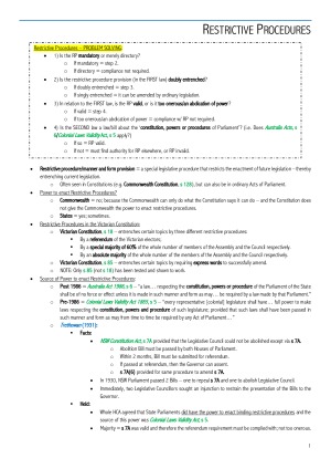These are the exact notes I used in the exam, and which I achieved a High Distinction with. Everything you need to know for the Consti Exam is perfectly summarised, with reference to the relevant case law and sections of the Constitution. The notes are structured with clear headings and subheadings. As well as this, each topic is organised in the same way it should be discussed in the exam ( in a skeleton/flowchart structure). Contents include: - Restrictive Procedures; - Executive Powers of the Commonwealth; - Commonwealth Legislative Power (General); - External Affairs Power; - Corporations Power; - Spending Powers; - Implied Intergovernmental Immunities; - Separation of Judicial Power; - Implied Freedom of Political Communication; - Freedom of Interstate Trade and Commerce; - Inconsistency between Commonwealth and State Laws.